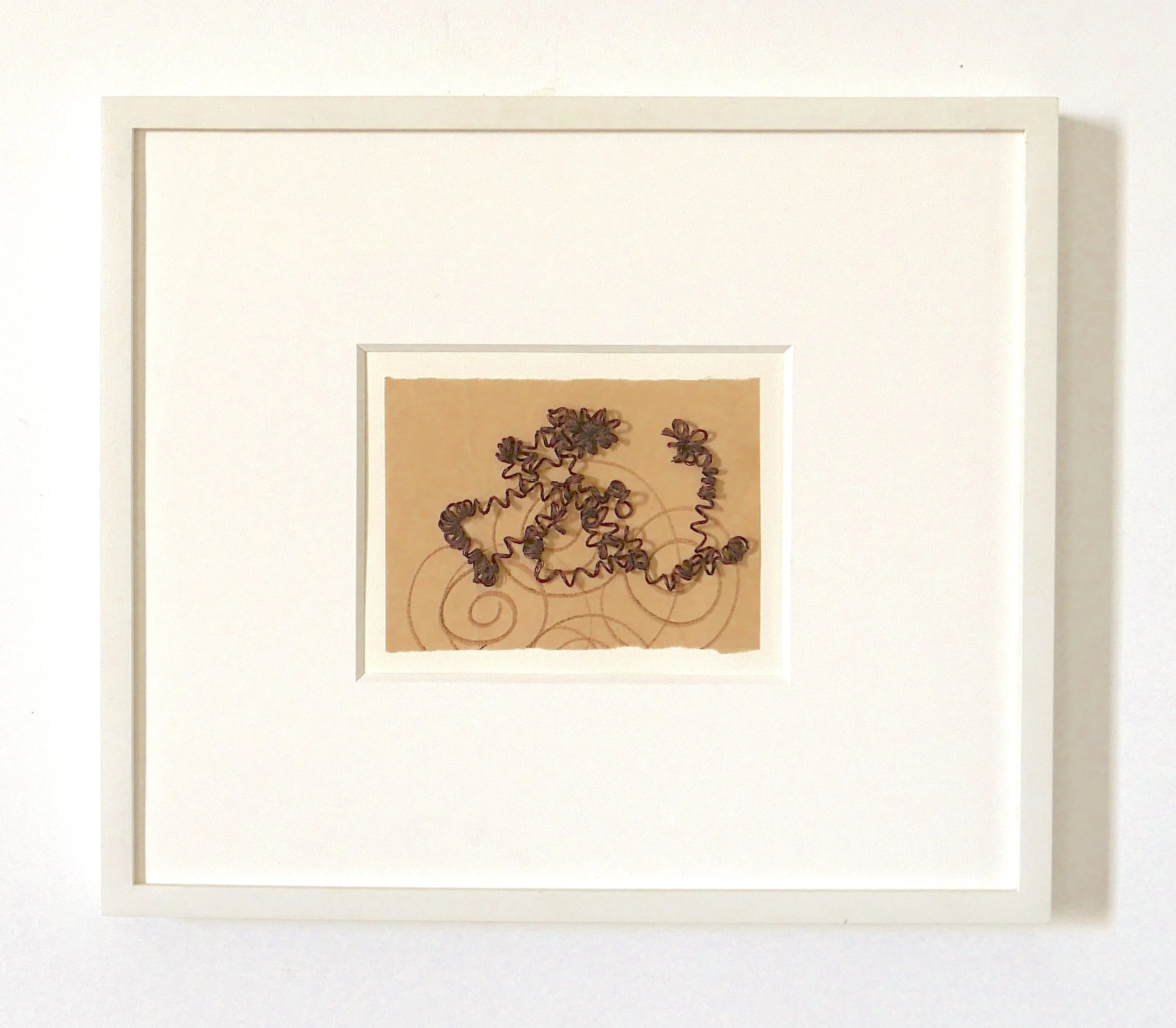 View fullsize   Untitled, 2025  papyrus, textile fragment, staples (framed)